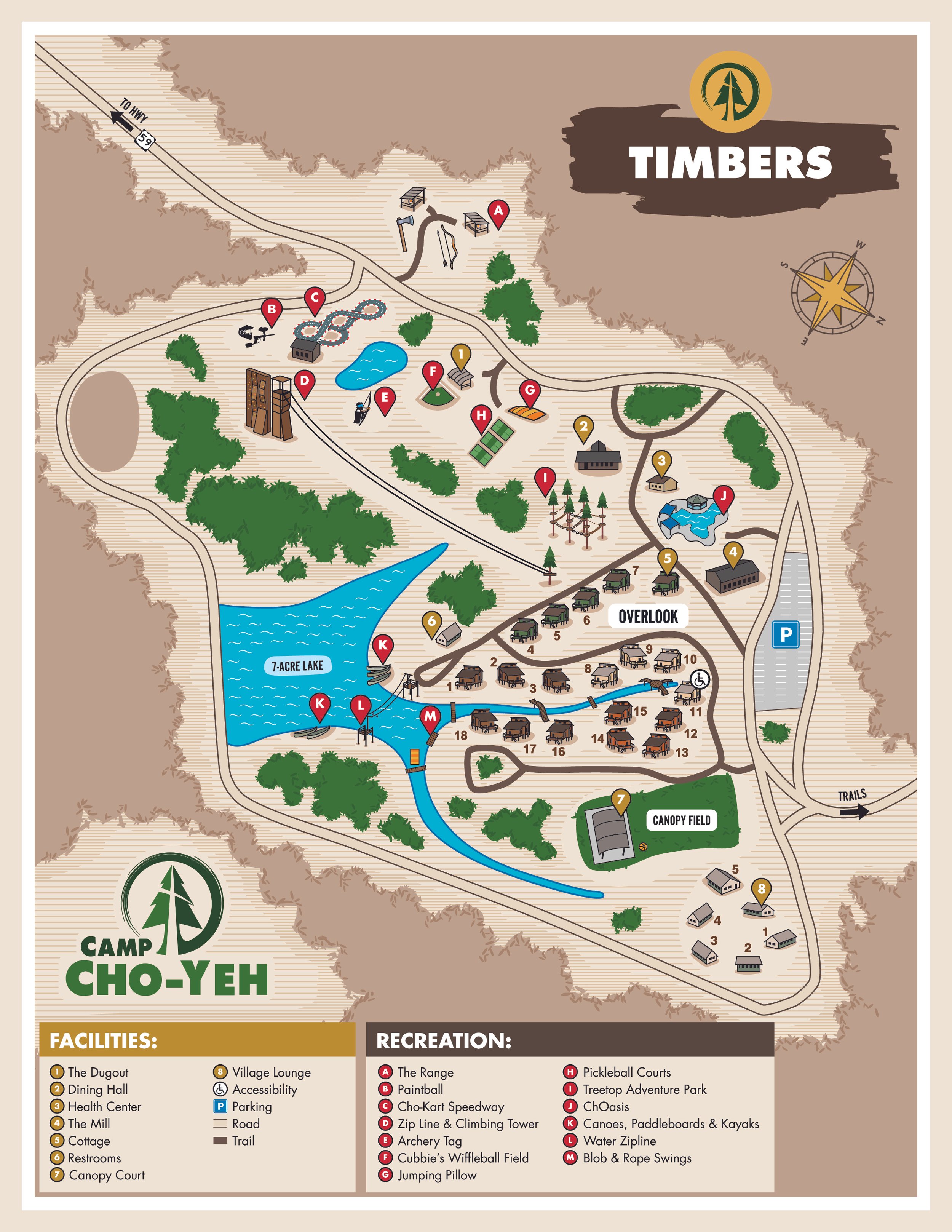 Once you enter through the Main gate off of Highway 59 stay on the gravel road until you come to a fork and follow the sign for Timbers. Leave your car in the parking lot and walk up to the registration station at The Mill. You can either carry your luggage with you or someone will return with you to your vehicle and pick it up for you. You and your belongings will be taken to your cabin from registration by camp staff. Vehicles are not permitted inside the campground. Please carpool if possible as parking is limited.
